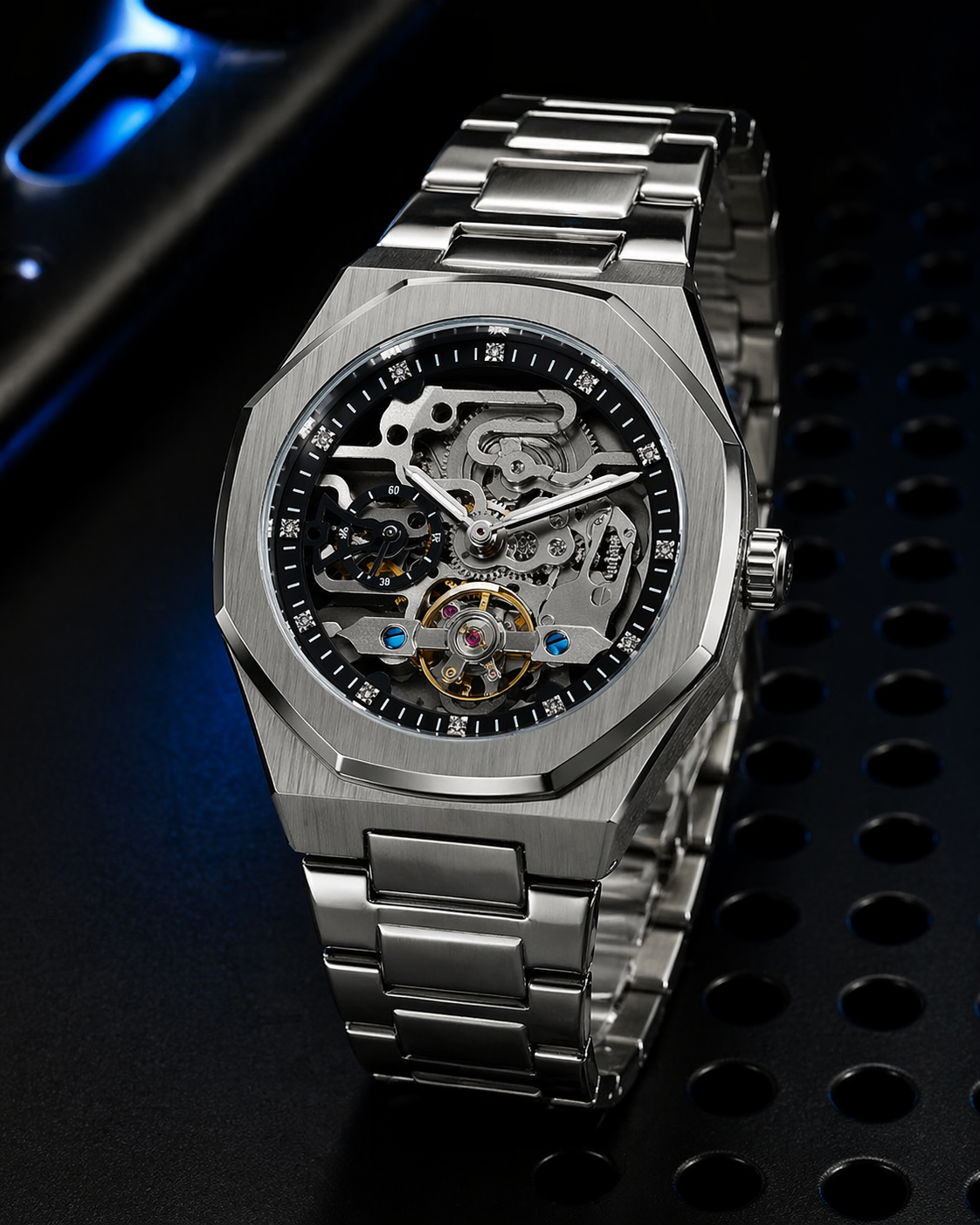 The watch is designed with a modern octagonal stainless steel case and a polished silver metal bracelet, making it a perfect accessory for both formal occasions and everyday wear.