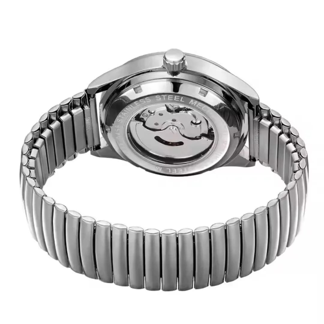 Elegant automatic watch with a clean white dial and stainless steel strap. No battery needed – perfect for daily wear and formal style.